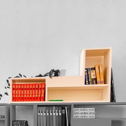 Модуль в форме буквы «L» оснащен тремя секциями для хранения книг, периодики или других предметов. Ячейки отличаются друг от друга высотой и шириной, поэтому подойдут для разноформатных изданий.