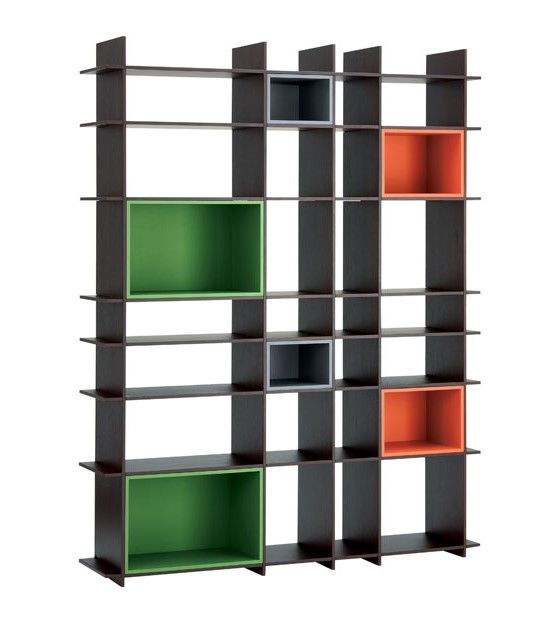 Книжный стеллаж на 5-ти сплошных опорах подходит для обустройства современной библиотеки. Мебель в прямоугольном корпусе из ЛДСП оснащена полками открытого и полуоткрытого типа. Конструкция может приставляться к стене или разграничивать помещение: доступ к материалам открывается с одной или с 2-х сторон. В стеллаже предусмотрено 6 цветных ячеек с глухими задними стенками
