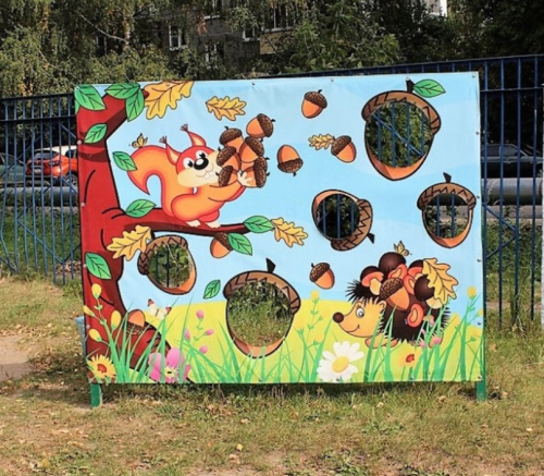 Баннер украшен полноцветным рисунком белки, желудей и ежика. Предусмотрено 5 отверстий для метания мячей. Ножки металлокаркаса устанавливаются в землю.