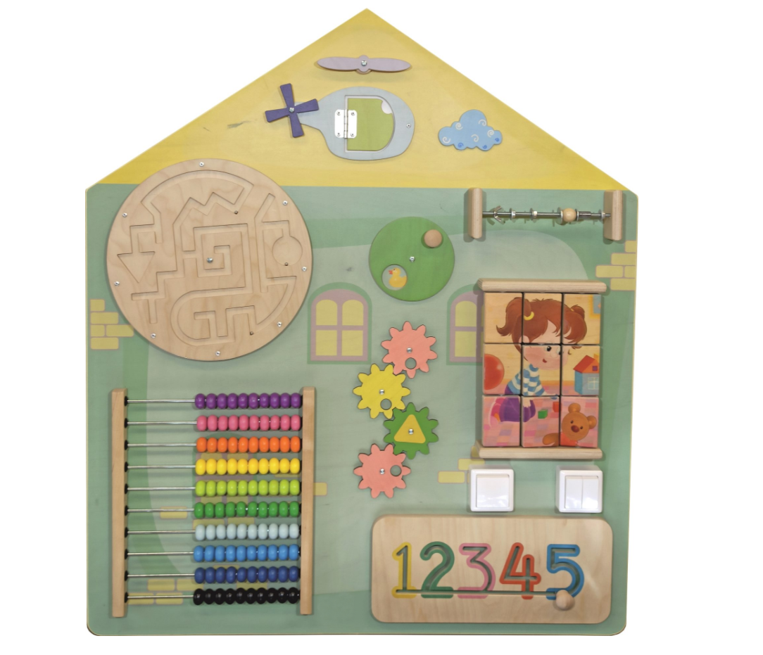 1-сторонний бизиборд для познавательного развития дошкольников выполнен в форме домика. Панель покрыта безопасной несмываемой краской, не имеет запаха. Поверхность можно дезинфицировать. Настенный бизиборд оснащается счетами, пазлами, вращающимися элементами, лабиринтами, шестеренками, замочками. Занятия с подвижными деталями дают первые представления об арифметике и физике, развивают сообразительность, моторику пальцев рук, фантазию.