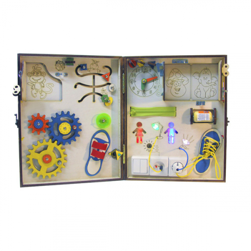 Складная панель с двумя створками и развивающим элементами применяется в детском саду. Бизиборд рассчитан на самостоятельное освоение, стимуляцию тактильных ощущений, тренировку зрительного восприятия. Во время занятий с элементами прогрессирует логическое мышление и моторика пальцев рук.
