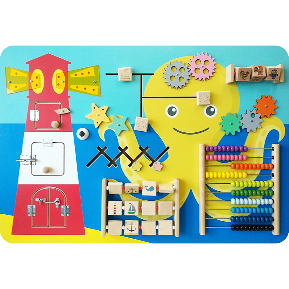 Работая с доской, дети совершают открытия и получают новые эмоции. Обилие текстур и форм тренирует концентрацию внимания. Для ухода за поверхностью бизиборда советуем использовать влажную ткань. Материал выдерживает действие дезинфицирующих средств.
