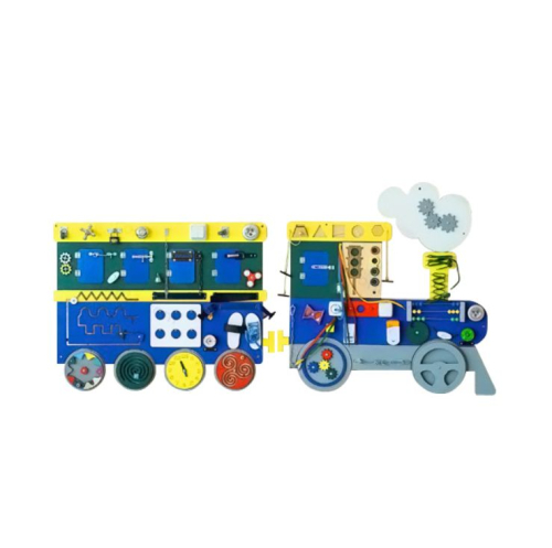 Бизиборд в виде паровозика состоит из двух частей. Панель оснащена большим количеством элементов, которые могут использоваться в развивающих играх: циферблат, счёты, шнуровка, песочные часы и пр.