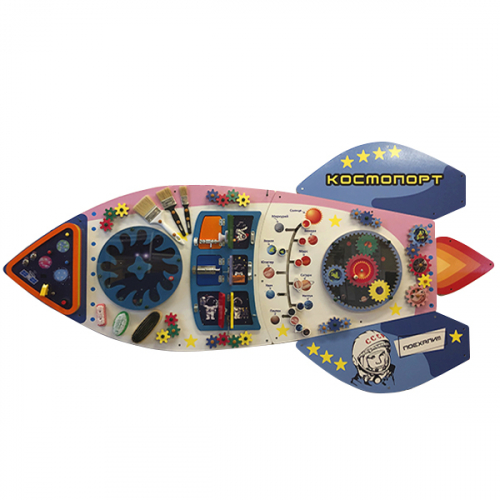 Бизиборд в виде ракеты оснащен различными тактильными элементами: шестеренки, лабиринт, дверцы и пр. Способствует развитию мелкой моторики, пространственного мышления и воображения.