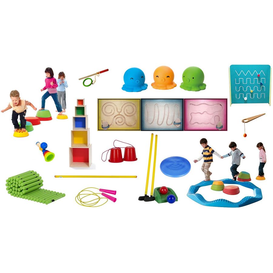 В комплекте: ступеньки, модули для перепрыгивания, панели для рисования, бизиборд с лабиринтом, тактильная дорожка, скакалка, удочка с кольцами.