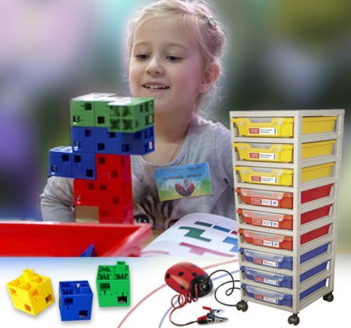 - базовый курс логики: 4 комплекта карточек в папках А4 с заданиями разной сложности, головоломки, игры (домино, цветные судоку, проекции и т.д.), 30 специальных кубиков в лотке,
