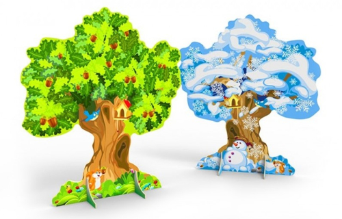 На двух сторонах прочной фигурной панели изображается дуб (с желудями и листвой или с сугробами и снежинками). Углы декорации закругляются.