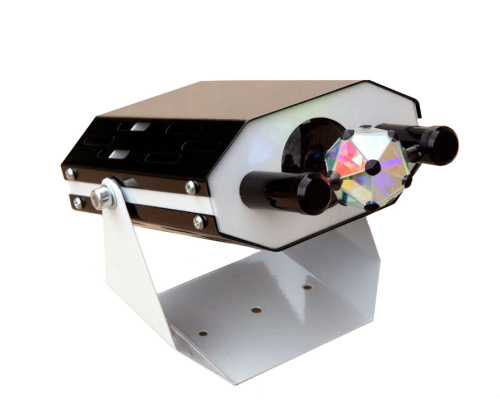 На выходе света из прибора установлен вращающийся 20-гранник из разноцветных дихроичных полуотражающих зеркал.