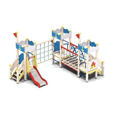 В составе комплекса: 3 башни, подвесной мост, горка, сетка для лазания, перекладины, 2 лестницы, наклонная лиана, ограждения.