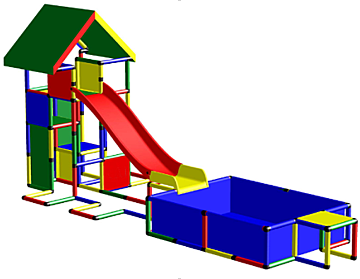 В комплект входят детали для создания дополнительных сооружений: модульной горки и бассейна. Изогнутый скат позволяет плавно замедлиться перед остановкой. К горке при необходимости подключается шланг для подачи воды (приобретается отдельно). Бассейн изготовлен из алюминиевого профиля и специальной пленки. Наполняется шариками, песком или водой. Предусмотрен сливной клапан.