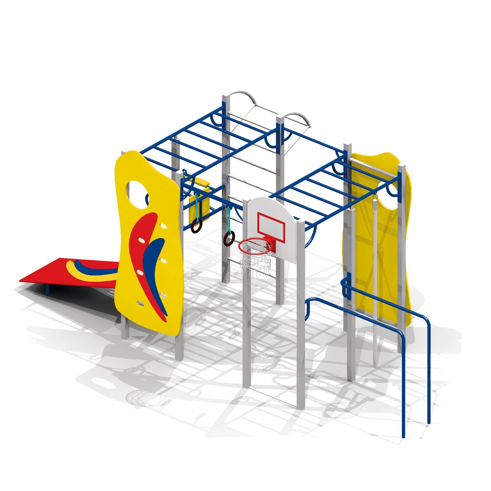 В составе комплекса: столбы, перекладины, гимнастические кольца, рукоходы, 2 альпинистские стенки с вырезами и зацепами, дуга со ступенями, параллельные брусья, гимнастическая скамья, канат, брусья для пресса, баскетбольный щит и кольцо, шведская стенка.