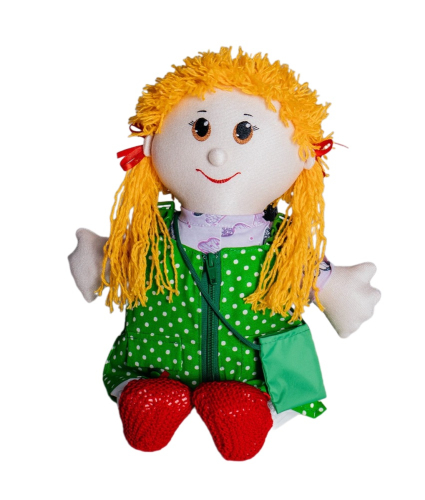 Мягкая кукла одета в наряды с застежками (молния, липучки, пряжки). Ребенок учится различать предметы гардероба, снимать и надевать их в определенной последовательности.