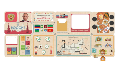 Настенная панель состоит из 6-ти тематических блоков: символика России, гербы и флаги регионов, территориальное расположение этносов, народные инструменты, языки, традиционные жилища и блюда народов.