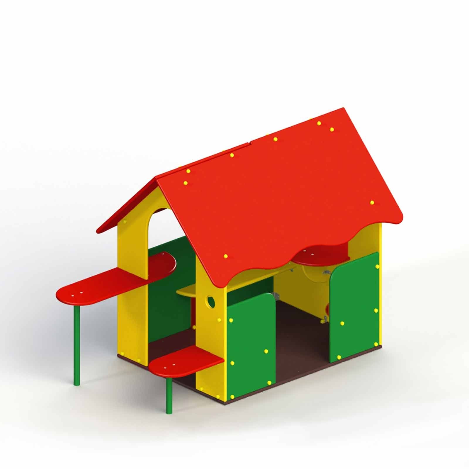 Уличный домик оснащен угловыми сиденьями, скамейкой, окном и подоконником, входной аркой, проемом между ограждениями, фигурными столиками на стойках, d 42 мм. Пол сделан из фанеры. Низ 2-скатной крыши волнообразный.