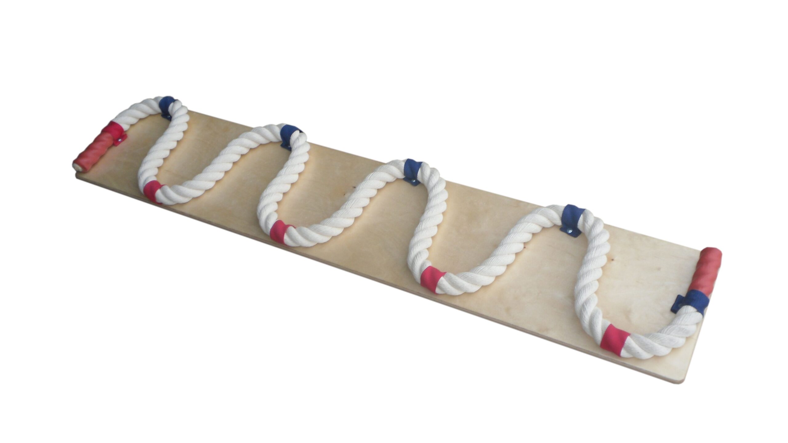 Канат закрепляется на многослойном фанерном основании. Следование по извилистой дорожке учит ребенка балансировать. Фанера покрывается лаком на водной основе.