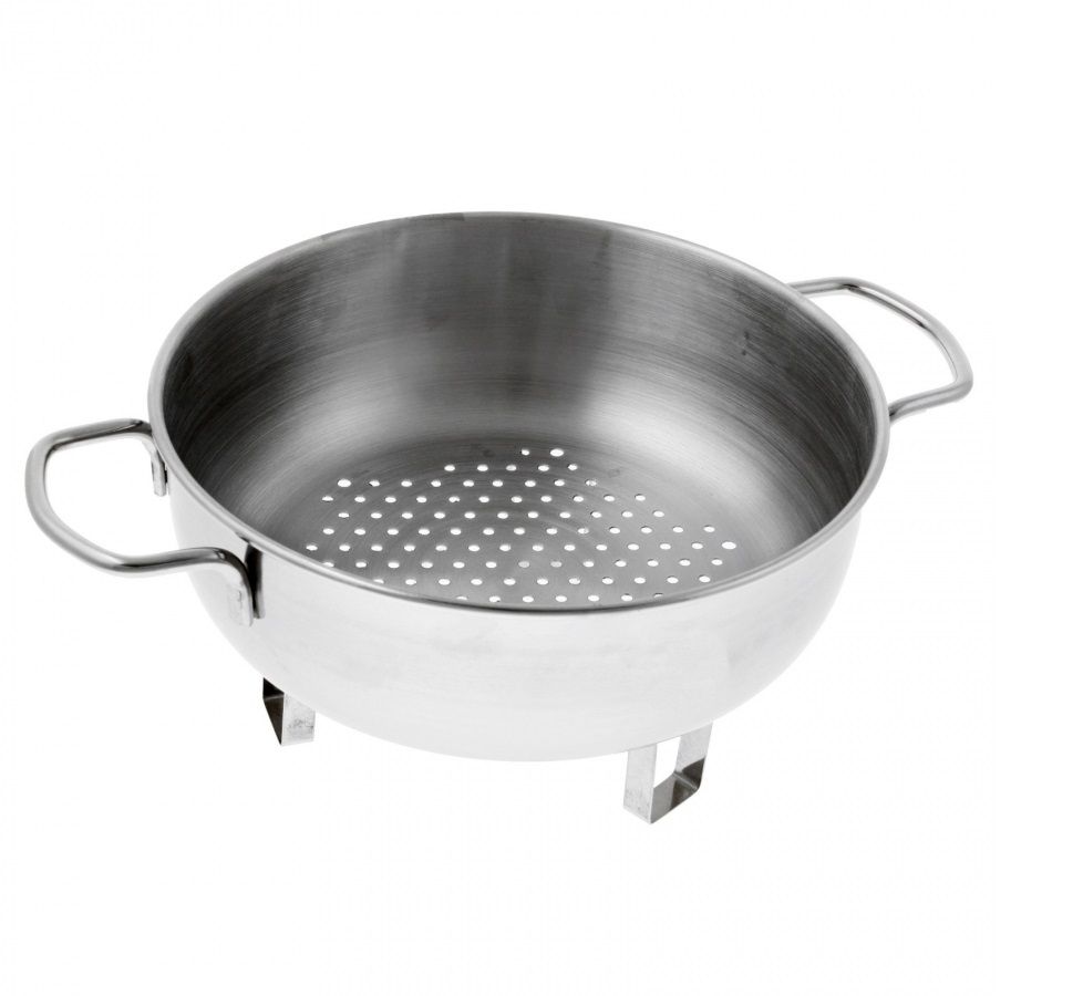 Дуршлаг необходим для промывания ягод, грибов, мелких фруктов и овощей, крупных зерен. Объемный дуршлаг на подставке с двумя ручками отлично подойдет для кухонь и столовых школ и детских садов.