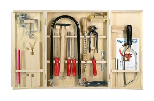 Практичный набор миниатюрных инструментов для работы по дереву способен увлечь детей старшего дошкольного возраста. Превосходно функционирующие молоток, шило, ножовка и проч. аккуратно уложены в тщательно отшлифованный ящик с замком. С помощью таких инструментов и прилагающихся заготовок с шаблонами легко можно создать красивую поделку и приобщиться к коллективной творческой и трудовой деятельности.