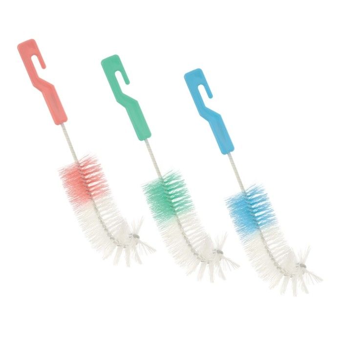 Ершик применяется во время мытья бутылочек. Инструмент изогнут для удобства использования, оснащен пластиковой ручкой с крючком.