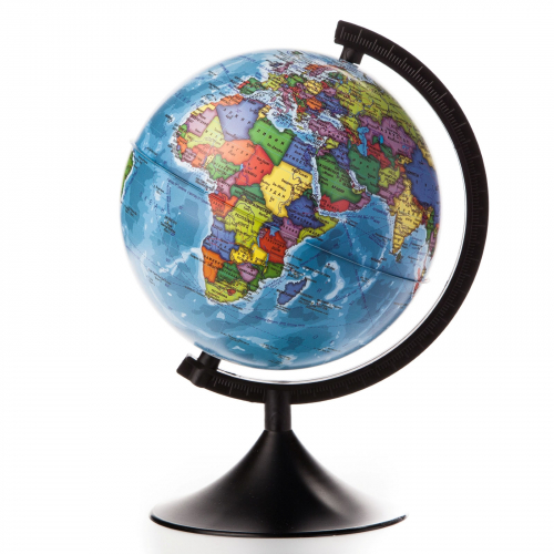 На цветной трехмерной модели Земли обозначено местоположение и границы государств, их названия и столицы, а также подписаны моря и океаны. Глобус устанавливается на подставку, его можно вращать вокруг оси.