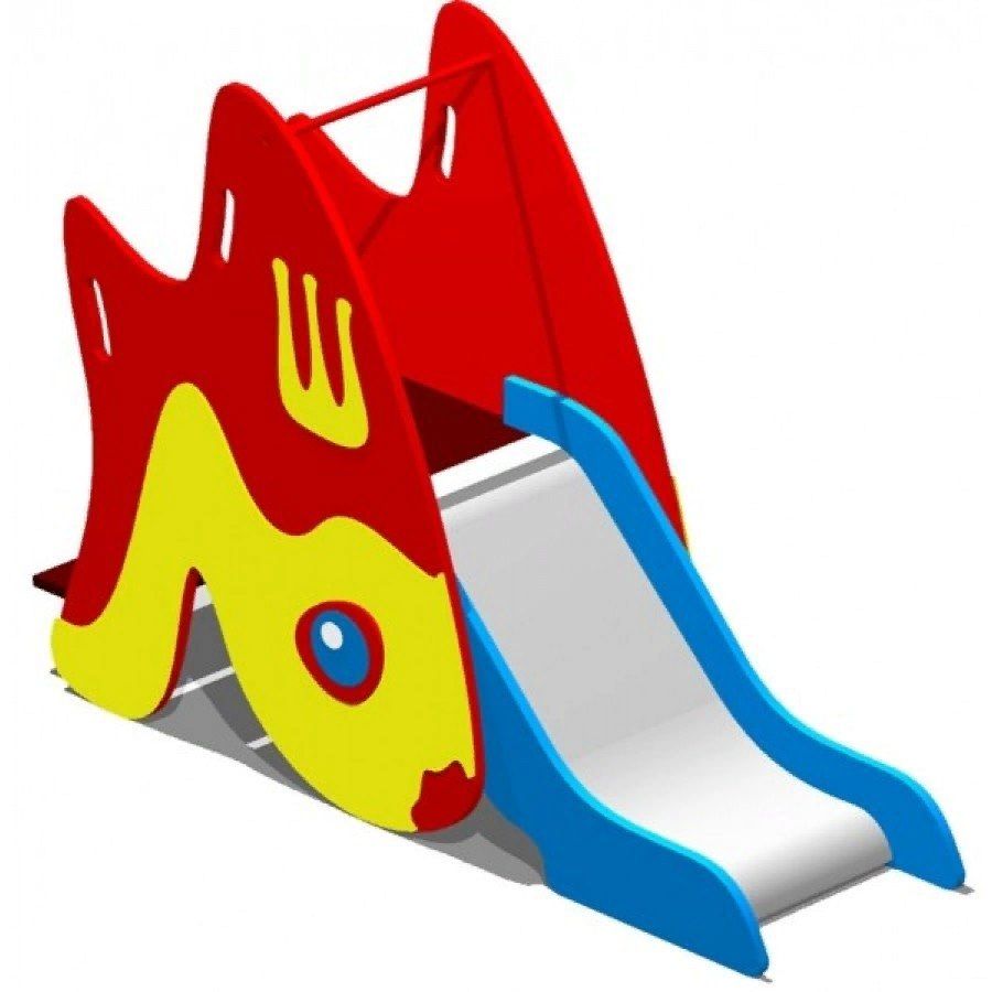 Горка в виде рыбки оснащена отверстиями для рук. Фигурные панели служат перилами лестницы и защитной секцией. На площадке с фанерным полом предусмотрена металлическая перекладина, d 33 мм. Стальной скат, толщиной 1,5 мм, не ржавеет. Бортики высотой 100 мм окружают его на всех участках: в зоне старта, скольжения, торможения.