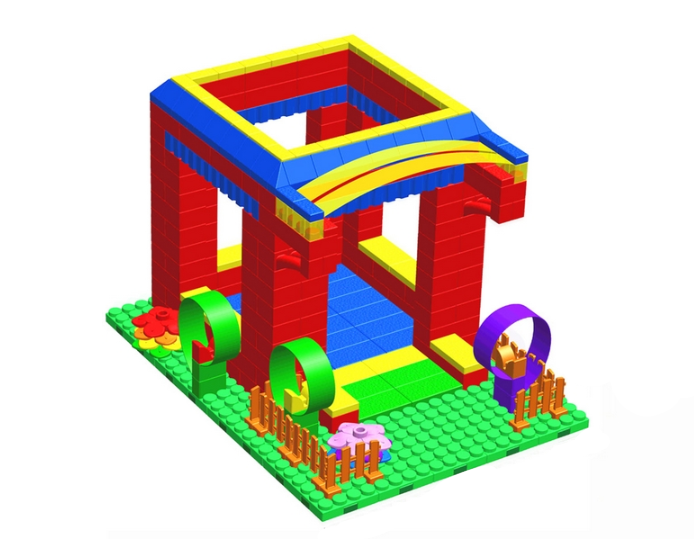 Собранный конструктор представлен в виде домика. Отлично подходит для игровых комнат в детских садах и ДОУ.