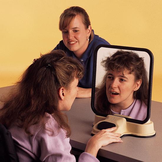 Логопедический инструмент (небьющееся зеркало прямоугольной формы, со скругленными углами, в оправе, на подставке с кнопкой) имеет записывающее устройство, встроенное в корпус, и динамик.