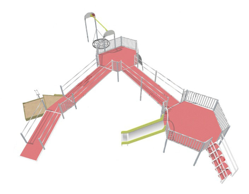 | В комплекте | Песочница двухуровневая;, 4 платформы высотой 400, 800 и 1200 мм, которые соединены пандусами шириной 800 мм;, Горка-скат;, Наклонный лаз с пластиковыми зацепами и канатом;, Качели-гнездо |