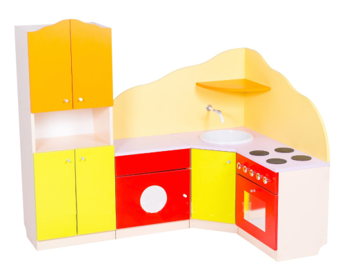 Комплект мебели «Кухня угловая с буфетом» подходит для оснащения игровой комнаты в детском саду. Включает в себя 5 закрытых боксов с полками, имитацию крана, раковины, конфорок, духовки, стиральной машины. Может использоваться для проведения сюжетно-ролевых игр.