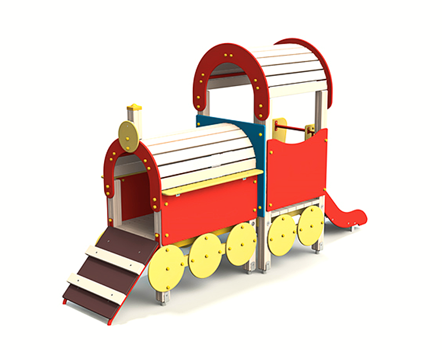 Стилизованный комплекс пробуждает фантазию ребенка. Сходство с локомотивом придают декоративные детали: имитация выпускной трубы, колес, прожектора. Облик довершают карнизы на ограждениях, арочный навес. Крыши с округлыми контурами выполнены из фанеры, устойчивой к воздействию осадков.