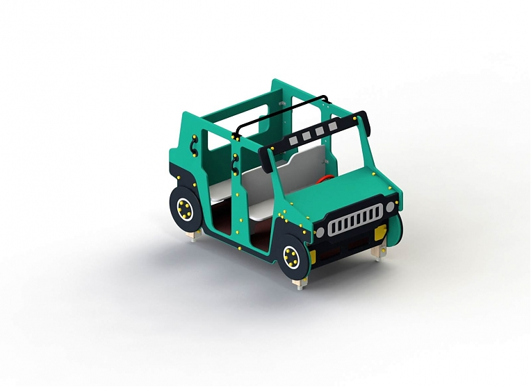 Конструкция включает в себя: несущие столбы, кабину, кузовные детали, поручни, колеса, крутящийся руль, сиденья со спинками, металлическая дуга на крыше.
