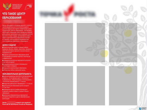 Светлое прямоугольное поле украшено логотипом и названием сети образовательных центров, а также пояснительной надписью. На стенде располагается информация для посетителей лаборатории. Поверхность оснащена двумя рядами прозрачных карманов для листов бумаги формата А4.