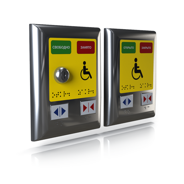 - крупные кнопки сопровождаются подсказками (световыми и голосовыми; с помощью них человек узнает, свободно ли помещение);