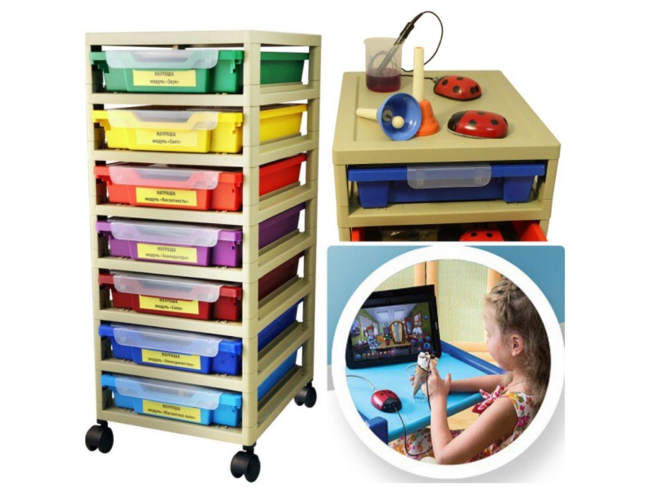 В каждом лотке есть датчик. Один модуль рассчитан на 4 занятия. Разноцветные контейнеры имеют рельефные бортики, закрываются крышками. Располагаются друг под другом в специальной стойке с ячейками, на 4-х поворотных колесах, с топом-полкой наверху. Количество отделений соответствует количеству модулей.