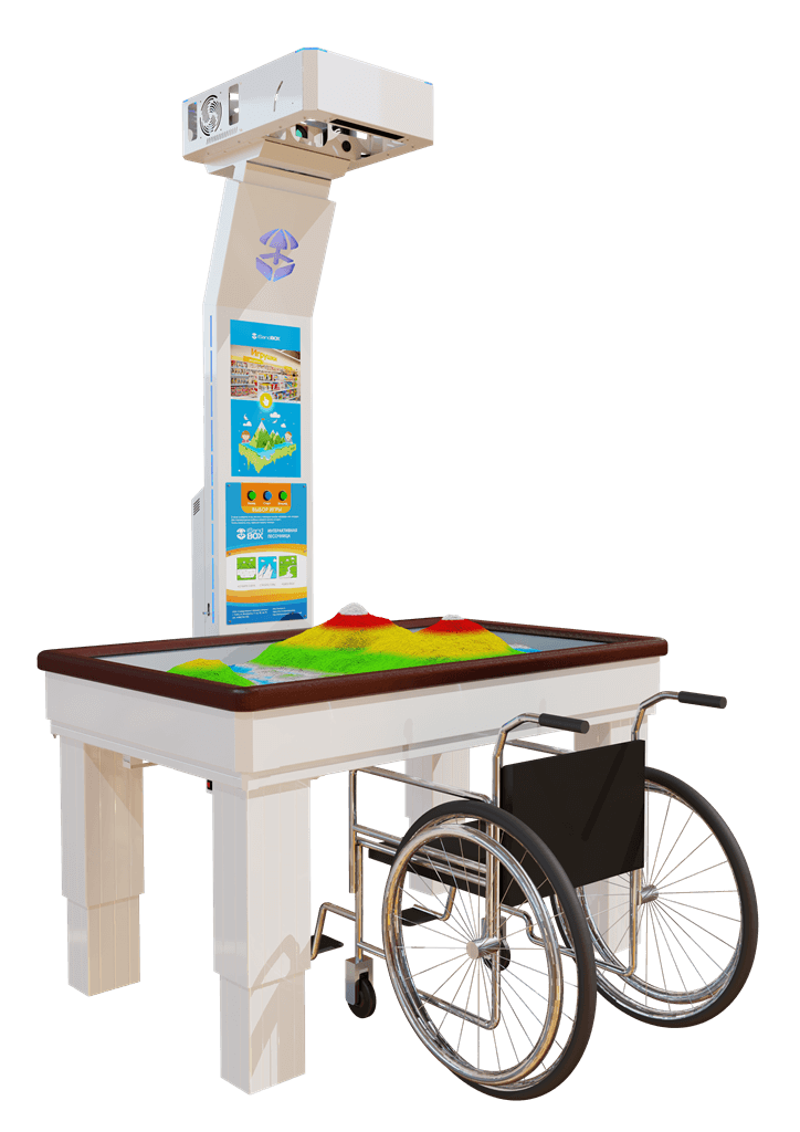 Песочница для коррекционной работы подходит детям с ОВЗ. Высота столешницы изменяется при помощи пульта ДУ. Предусматривается 2-уровневая система защиты от травм.