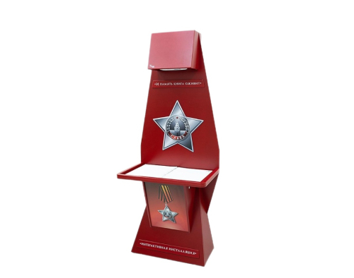 Книга предназначена для интерактивной презентации военно-патриотического контента советской эпохи. Листы можно переворачивать. В верхней части стойки располагается проектор, который выводит на листы изображение. При перелистывании страниц информация на них меняется.