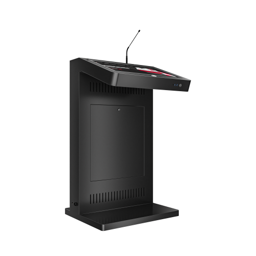 Трибуна оснащена мощным микрофоном, сенсорным дисплеем для спикера, а также дополнительным большим внешним дисплеем и набором разъемов для подключения техники.