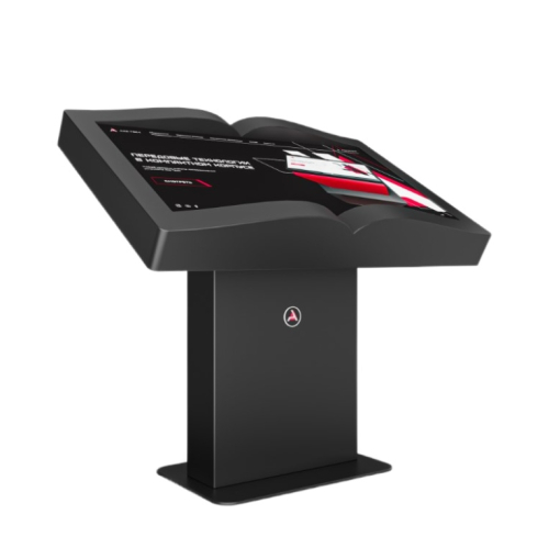 Форм-фактор стола выполнен в виде раскрытой книги. Механическая регулировка дисплея позволит настроить пользователям оптимальный угол для просмотра информации. Оборудование может дополняться информационным приложением или интерактивной книгой с эффектом пролистывания страниц.