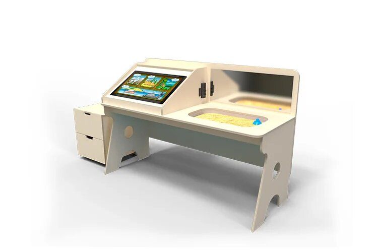 За столом можно играть с песком, проходить тесты, тренировать память. Перед зеркалом выполняются логопедические упражнения. Вопросы анкет выявляют особенности личности.