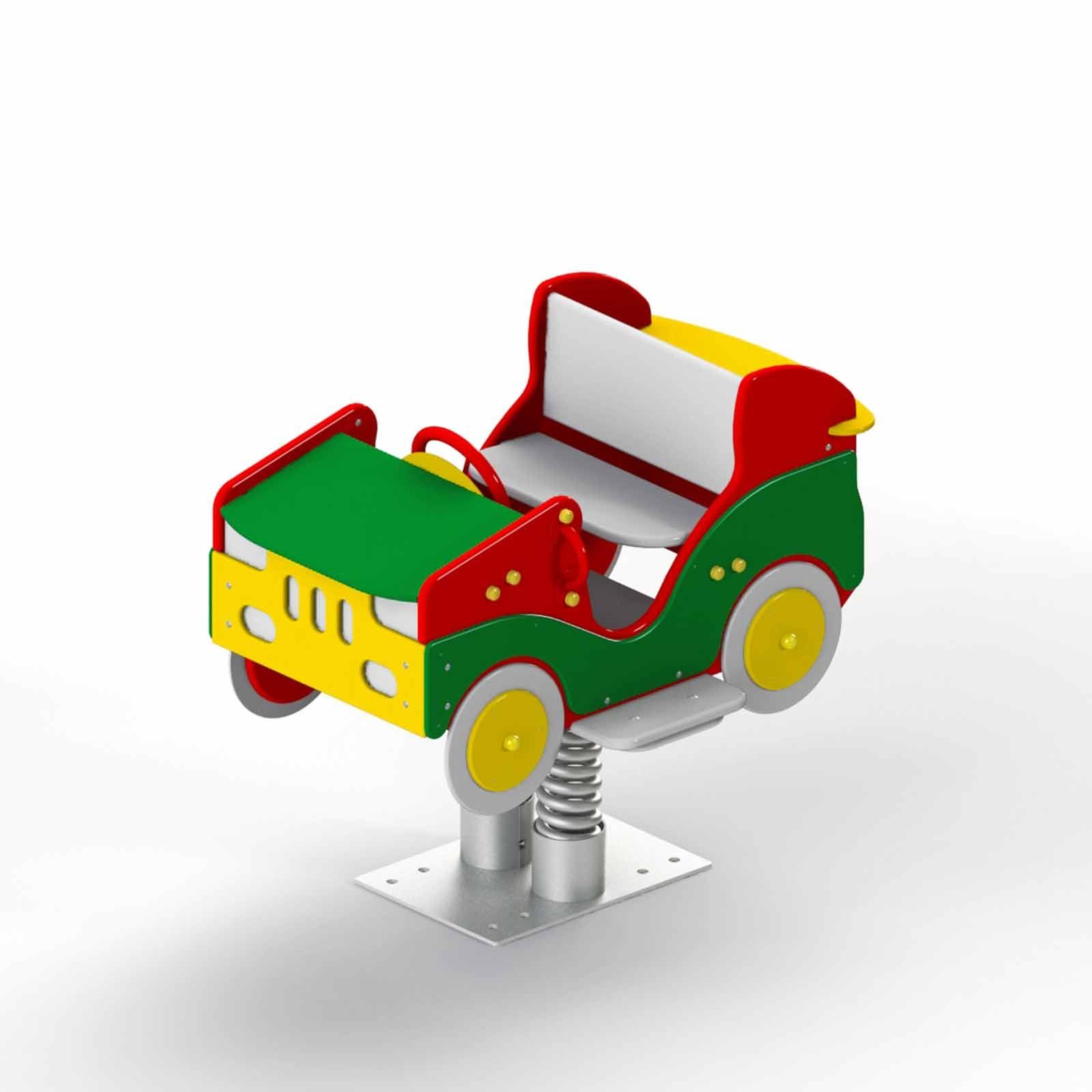 Основание представлено 2 плитами (верхней и нижней) и 2-мя цилиндрами, между которыми закрепляются 2 оцинкованные виброустойчивые пружины. Разноцветный корпус “Кабриолета” образован передним и задним бампером, боковыми стенками, панелью с решеткой радиатора, колесами, фарами. Гладкое сиденье со скругленными углами рассчитано на 2-х человек. Отшлифованная фанера окрашена гипоаллергенным покрытием.