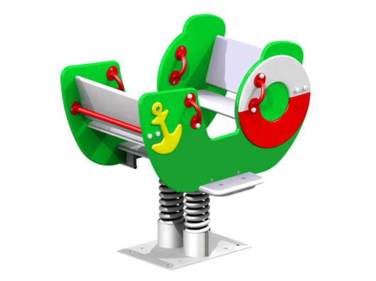 2-х местный балансир оснащен парными элементами: пружинами (d 26 мм), перекладинами жесткости, опорами для ног, фанерными посадочными местами со спинками. В комплексе 8 поручней (d 21 мм). На боковых панелях в виде корабля накладные элементы-якорь, спасательный круг. Для входа предусмотрены выемки в стенках.
