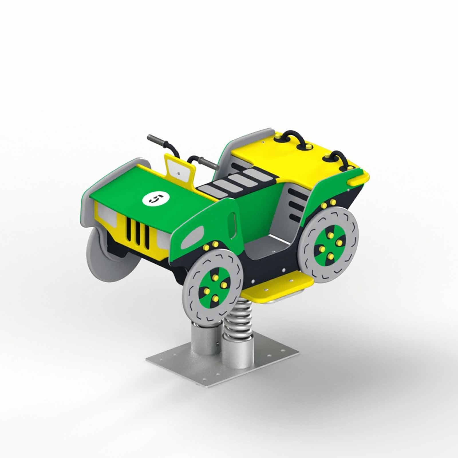 В основании качалки устанавливаются опорные плиты и цилиндры, между которыми закрепляется пружина. В разноцветном корпусе: передний и задний бампер, панель с решеткой радиатора, фары, металлический руль, резиновые рукоятки, колеса. Декоративные элементы изготавливаются из вандалоустойчивых материалов и покрываются гипоаллергенным порошковым покрытием.