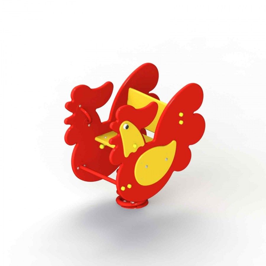 Качалка оснащена ударопрочной пружиной, закрепленной между 2-мя опорными плитами. Сиденье и спинка фанерные. Впереди 2 поручня. Боковые стенки с накладными элементами выполнены в форме петуха. Перекладина жесткости и опора для ног изготовлены из труб (d 26 мм).
