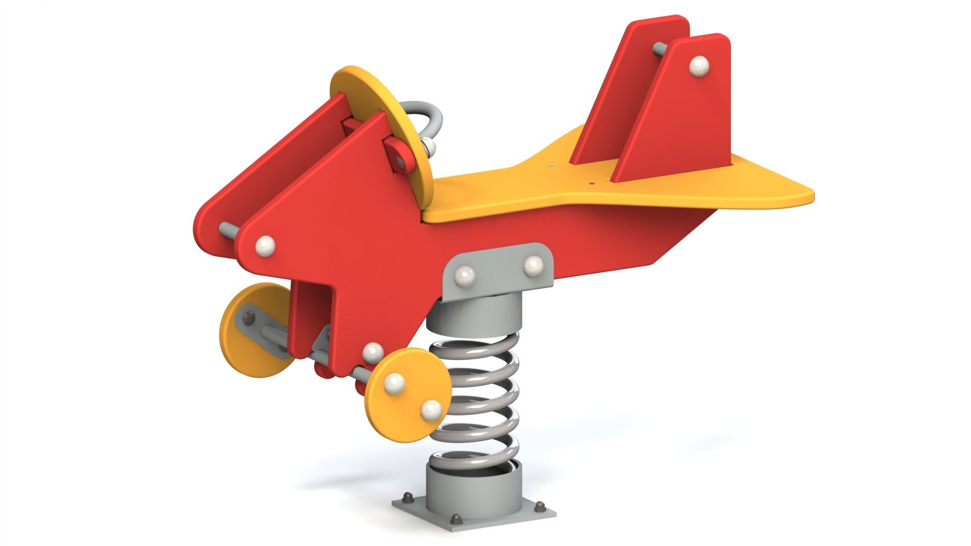 Качалка на оцинкованной пружине (d 26 мм) выполнена в форме самолета. Фанерные элементы образуют посадочное место, дополненное металлическим поручнем (d 21 мм). Для ног предусмотрены 2 подставки. Пружина фиксируется под корпусом, между 2-мя опорными плитами.
