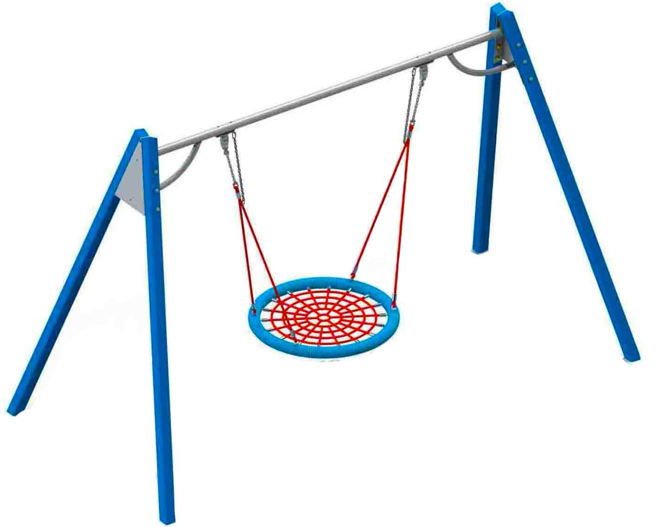 Качели опираются на парные стойки сечением 80х80 мм. Между ними перекладина (d 60 мм) с ребрами жесткости (d 42 мм). Углы закрыты накладками. К балке присоединяется гибкий подвес: верхняя часть (600 мм) из оцинкованной цепи, нижняя (1300 мм) из каната. Выпуклое сиденье оформлено канатной паутиной. Сетка из полиамида (d нитей 16 мм) фиксируется алюминиевыми креплениями на круглом каркасе (d 950 мм).