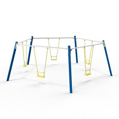 В комплексе 5 несущих стоек, 5 перекладин с гибкими подвесами (стальными цепями), 5 сидений. Опоры сечением 100х100 мм выполнены из профильных труб. D поперечной перекладины 60 мм. Длина цепей 1400 мм. Поверхность сиденья из обрезиненного металла дополнена фигурными отверстиями.