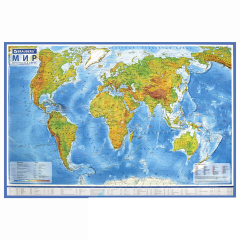 Карта мира физическая 101х66 см, 1:29М, с ламинацией, интерактивная, европодвес, BRAUBERG, 112377