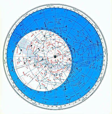 Широкая голубая полоса – Млечный Путь. Границы созвездий показаны пунктирными линиями, сетка экваториальных координат (склонение δ и прямое восхождение α) – голубыми линиями. В центре Северный полюс мира. Окружность, имеющая нулевое склонение, – небесный экватор. Черная овальная линия, пересекающая небесный экватор в двух точках (весеннего и осеннего равноденствия), – эклиптика.Подвижный круг предназначен для изучения суточного и годового изменения вида звездного неба в средних широтах северного полушария Земли (около 50–60° северной широты), а также определения моментов кульминации звезд и Солнца. Контур овального выреза (прозрачной части) на подвижном круге – линия горизонта, на которой отмечены точки юга, севера, запада и востока. Линия, соединяющая точки севера и юга, – неподвижный небесный меридиан.