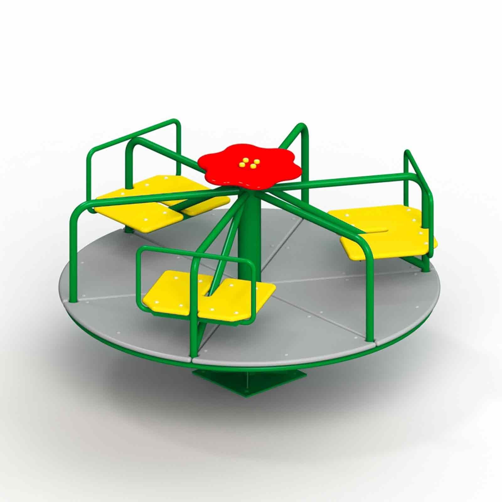 Детское оборудование размещается на территории ДОУ или школы. Уличная карусель, оборудованная рулем, используется для тренировки вестибулярного аппарата.