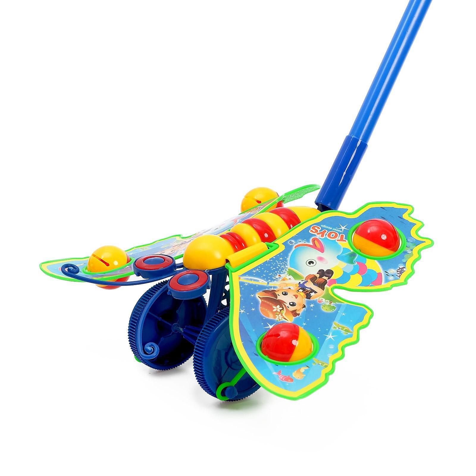 Детская игрушка в виде бабочки оснащена 2-колесами и рукояткой с крючком. Каталка не имеет острых углов, приводится в движение механически. Длина палочки составляет 370 мм.
