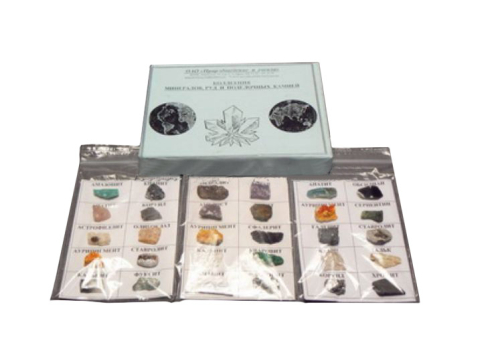 Каждая планшетка содержит 10 образцов различных минералов с указанием названия и места добычи. Планшетки упакованы в полиэтиленовые пакеты с замком.